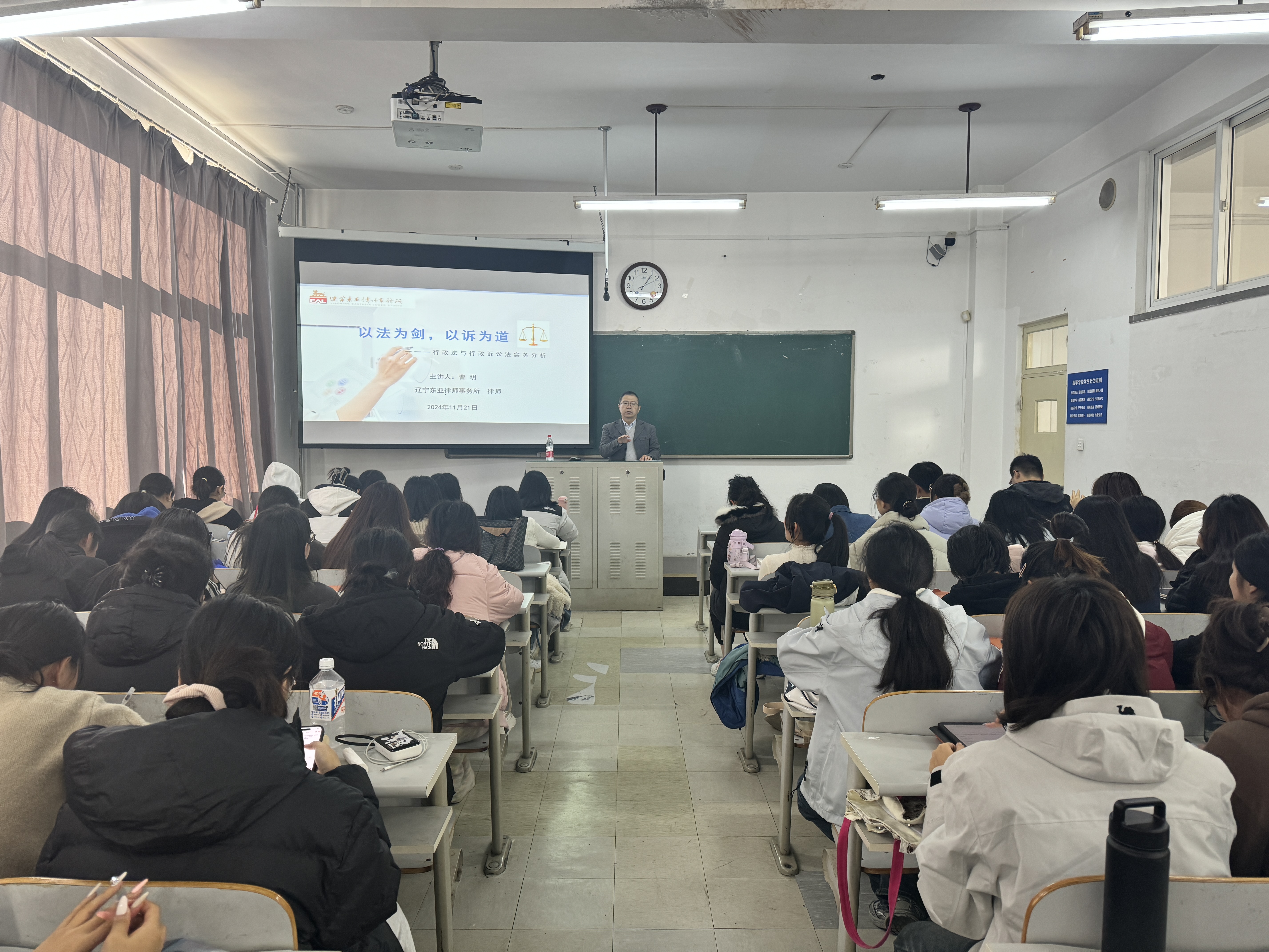 11月21日下午,365英国上市公司开展2022级法学专业本科生行政法与行政诉讼法实践教学活动,公司邀请辽宁东亚律师事务所曹明律师为员工讲授“以法为剑,以诉为道--行政法与行政诉讼法实务分析”讲座。讲座由365英国上市公司裴兆斌教授主持。