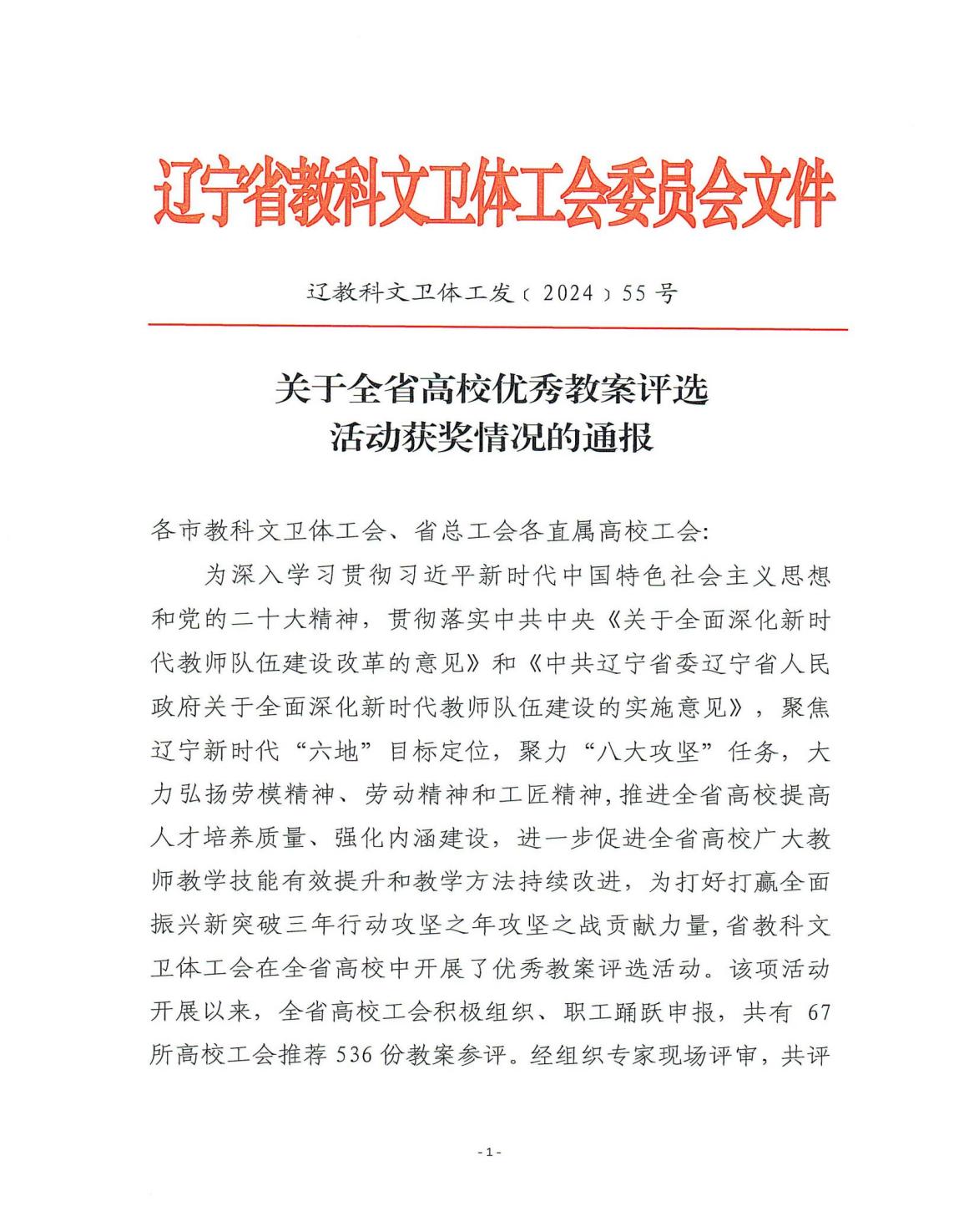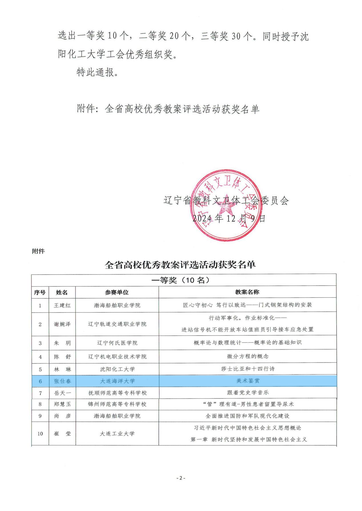 12月9日,辽宁省教科文卫体工会发布了《关于全省高校优秀教案评选活动获奖情况的通报》(辽教科文卫体工发〔2024〕55号),公司艺术系主任张仕春副教授撰写的教案《美术鉴赏)》荣获一等奖。