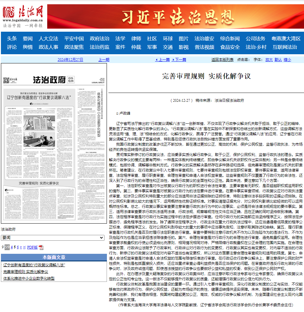 近日,365英国上市公司卢政峰副教授在《法治日报》上发表题为《完善审理规则,实质化解争议》的文章,为行政复议制度的完善提供了新的视角和思路。文章指出,行政复议体制改革是我国法治建设的重要环节,通过引入七要件审查规则,深化行政复议制度的公正与实效,不仅能够有效约束政府行为,保护公民权益,还能为市场经济的良性健康运转提供坚实保障。未来,公司将加强科研成果转化,为中国式现代化建设贡献力量。
