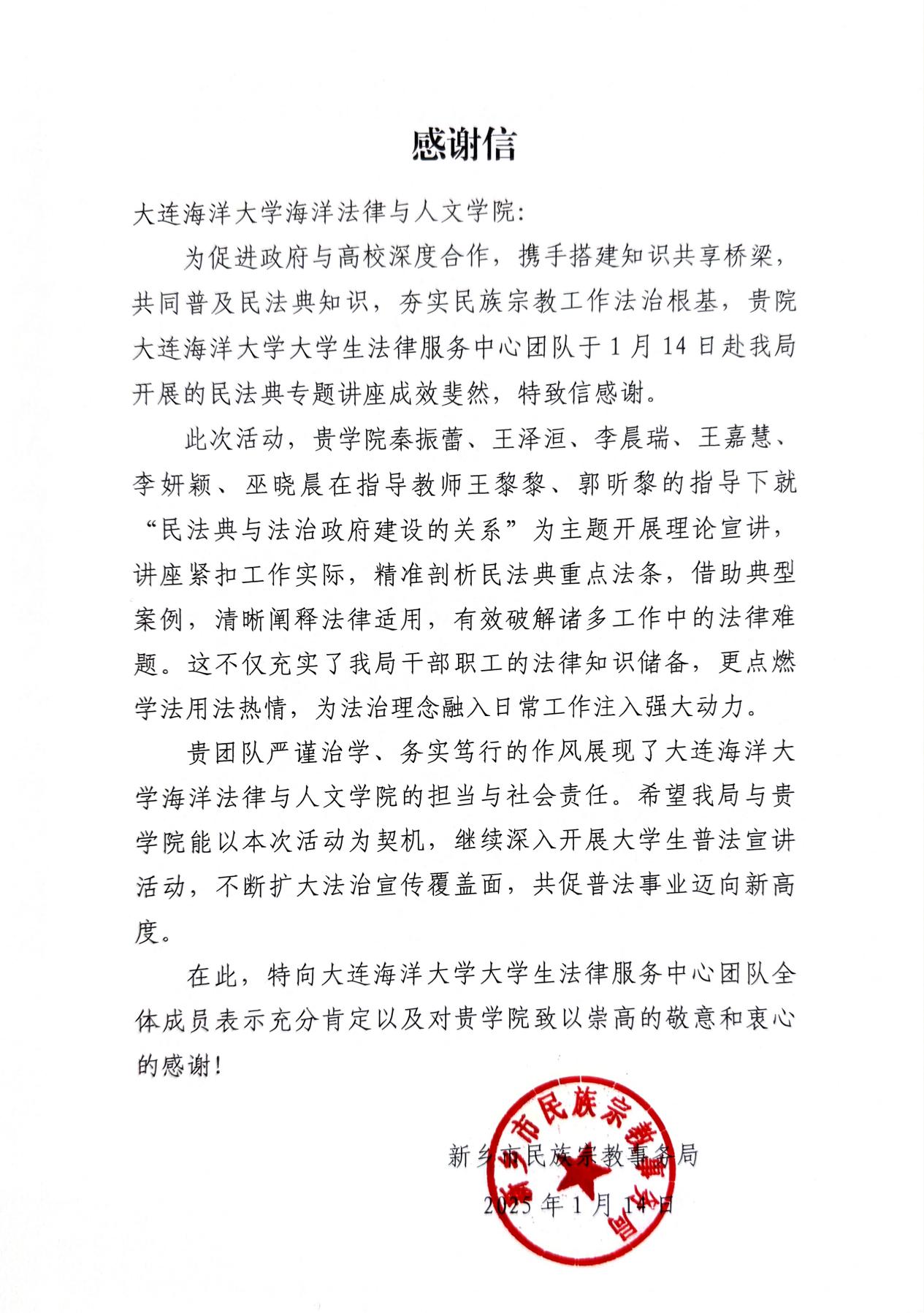 近日,公司收到了新乡市民族宗教事务局发来的感谢信,感谢老员工法律服务中心开展的民法典专题讲座。希望双方继续深入开展老员工普法宣讲活动,共促普法事业迈向新高度。