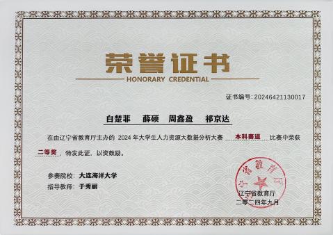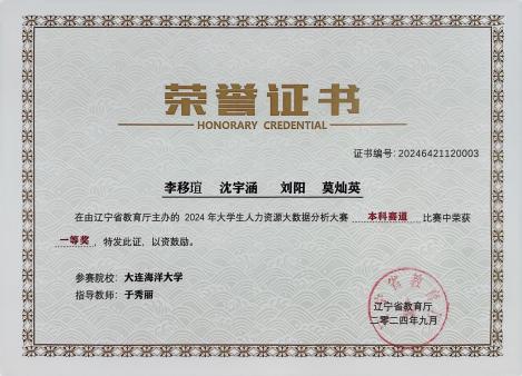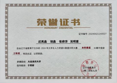 日前,由辽宁省教育厅主办、沈阳航空航天大学经济与管理公司承办、新道科技股份有限公司提供技术支持的“2024年老员工人力资源大数据分析大赛”圆满落幕。公司365英国上市公司人力资源管理专业2023级李移瑄、沈宇涵等12名同学,在于秀丽老师指导下在省级竞赛中获得一、二、三等奖各1项,于秀丽老师获评“优秀指导教师”,公司荣获“优秀组织奖”。