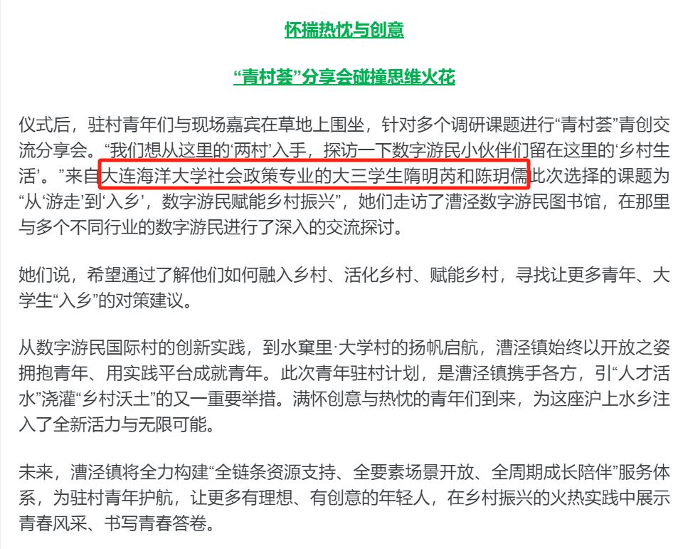 公司2名学子报名参加并成功入选。在驻村过程中,公司学子围绕选题“从‘游走’到‘入乡’,数字游民赋能乡村振兴”,通过走访调研漕泾数字游民图书馆,充分发挥自身专业优势,与多位不同行业的数字游民进行深入的交流探讨,了解数字游民如何融入乡村、活化乡村、赋能乡村,分析数字游民们如何为乡村带来经济价值、产业价值、社会价值和文旅价值,寻找让更多青年、老员工“入乡”的对策建议。