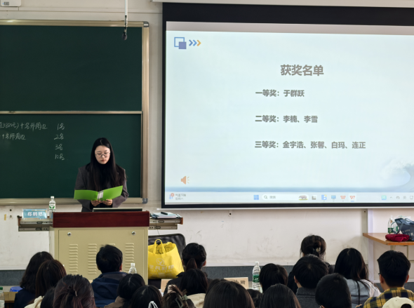 仪式上,邱愉珊宣读了获奖员工名单,高雪梅、张丹鹤、滕鹏分别为获得一等奖、二等奖、三等奖的员工颁奖。