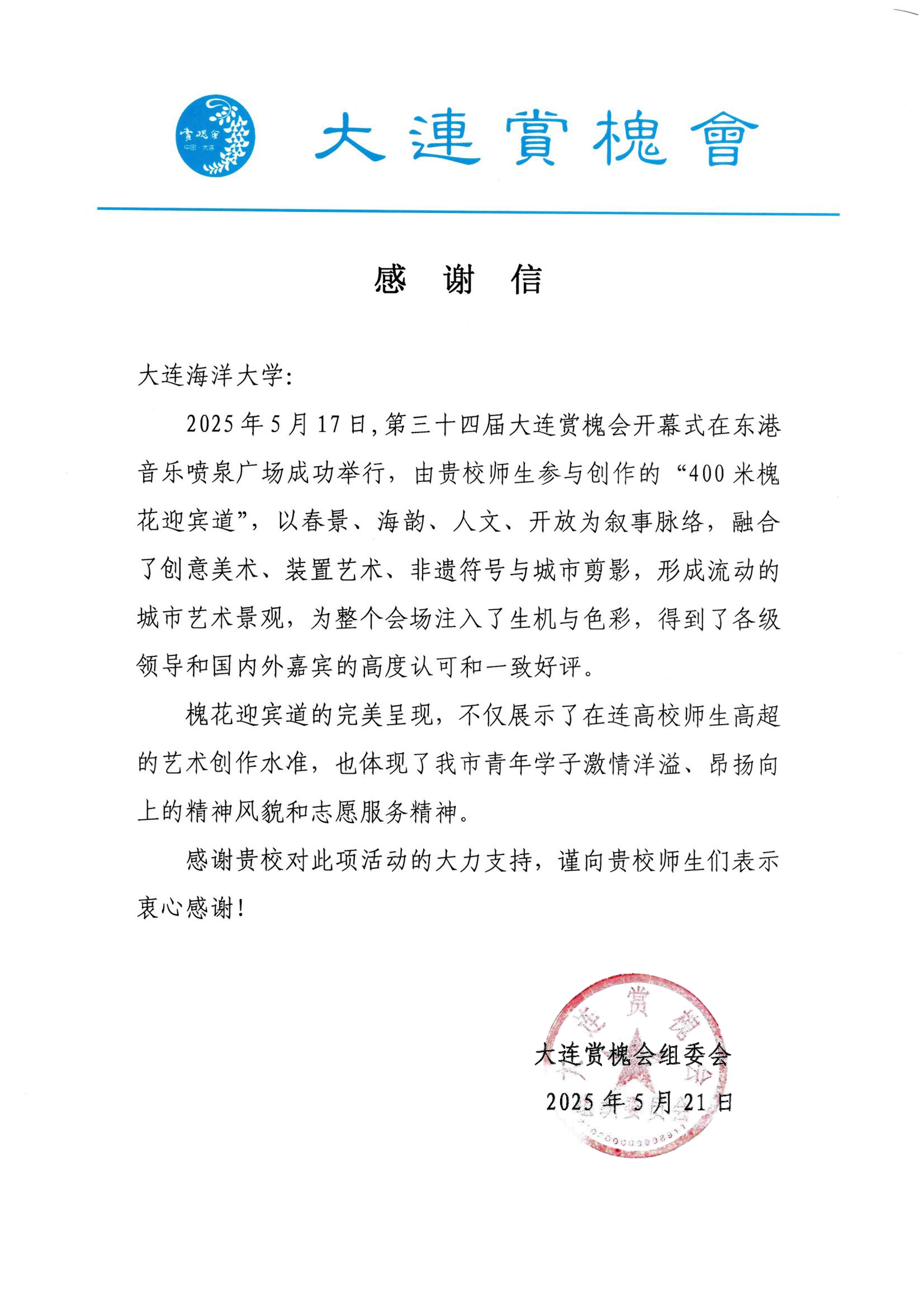 近日,第三十四届大连赏槐会组委会向公司发来感谢信,感谢公司师生参与创作了“400米槐花迎宾道”,展示了高超的艺术创作水准,展现了青年学子激情洋溢、昂扬向上的精神风貌和志愿服务精神。