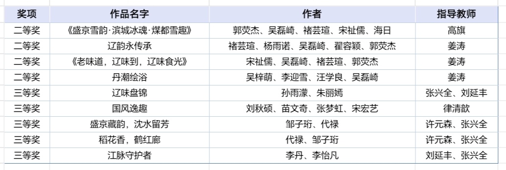 10月27日,公司艺术系高旗副教授带领视觉传达设计专业8名员工组成参赛团队,赴辽东公司参加2025年辽宁省普通高等公司老员工国潮文化设计应用比赛现场答辩,取得4项二等奖、5项三等奖的优异成绩。
